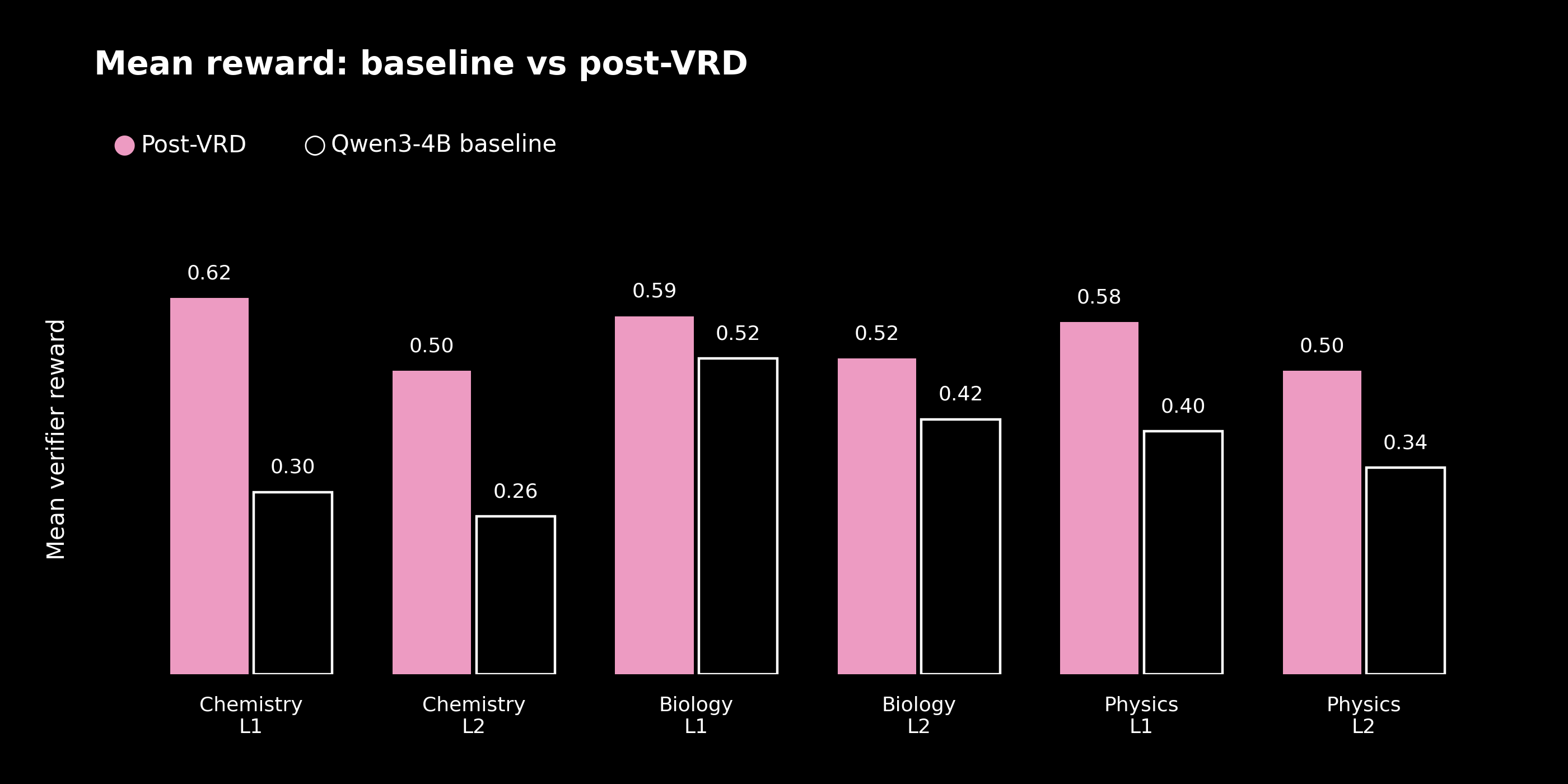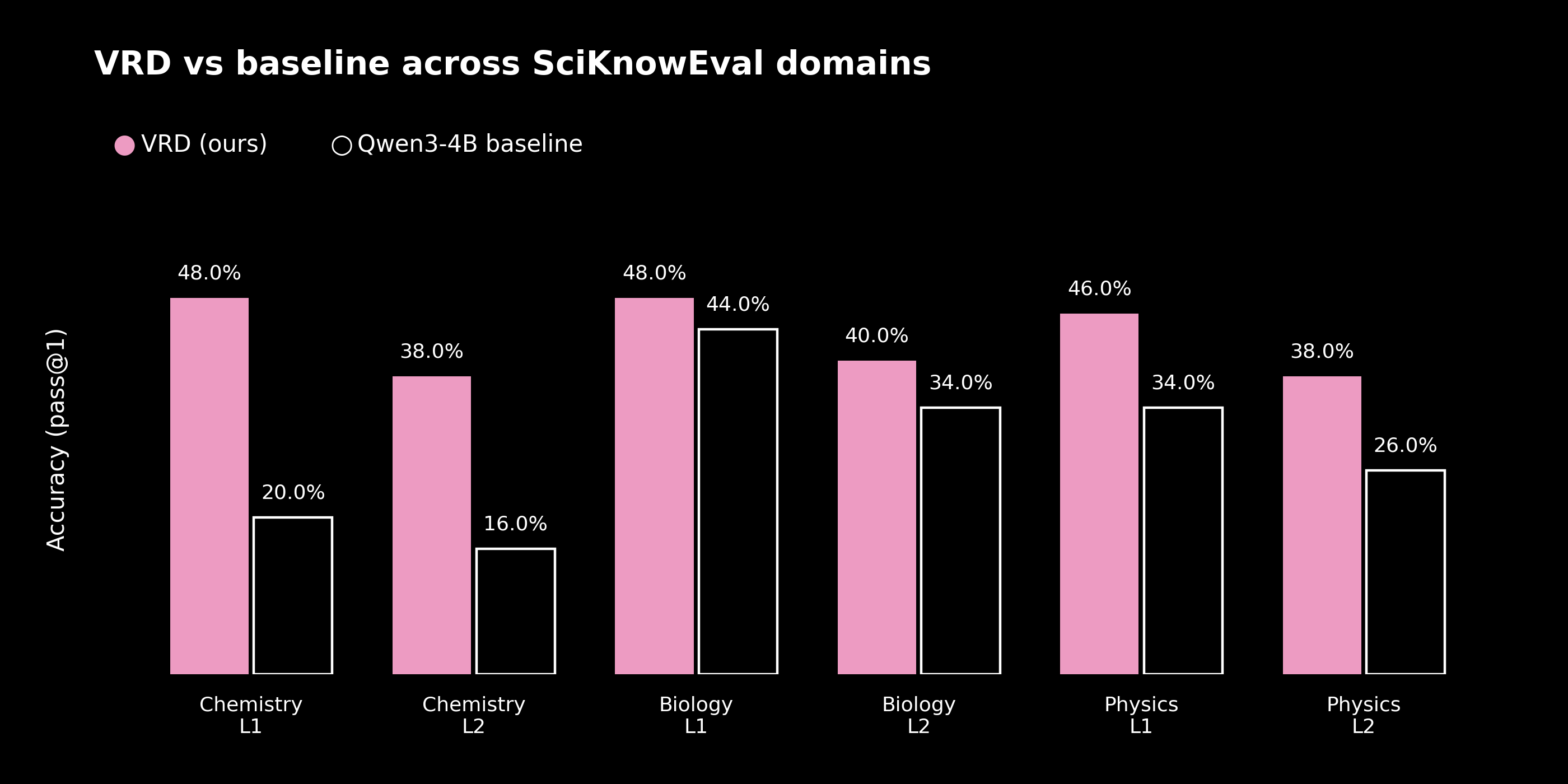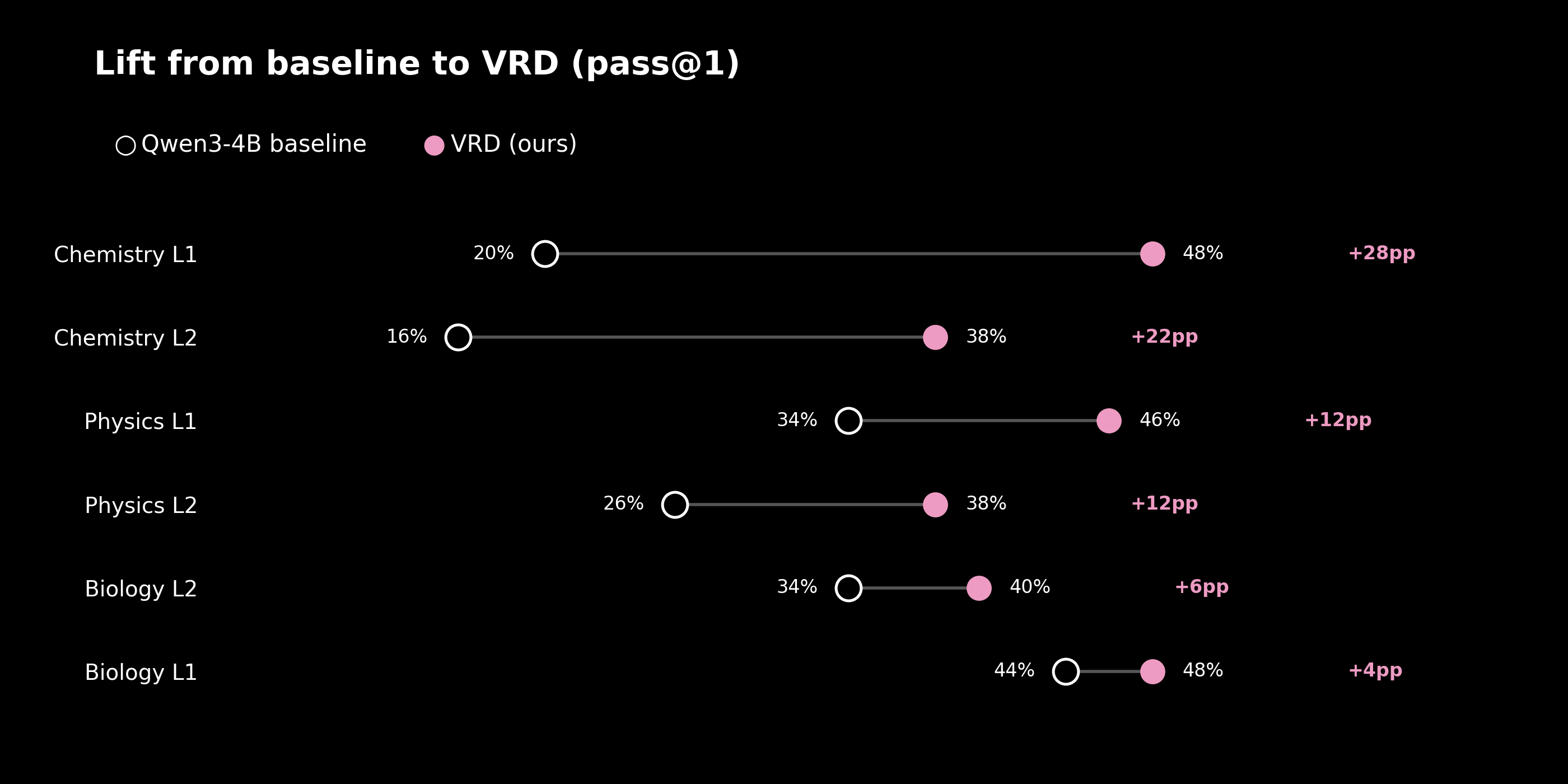 The largest gains appear where the baseline is weakest. Chemistry at level one rises from 20.0% to 48.0%, a factor of roughly 2.4. Biology, which starts from the strongest baseline, improves least. This is the shape one would expect from a recipe whose curriculum is organized around failure.